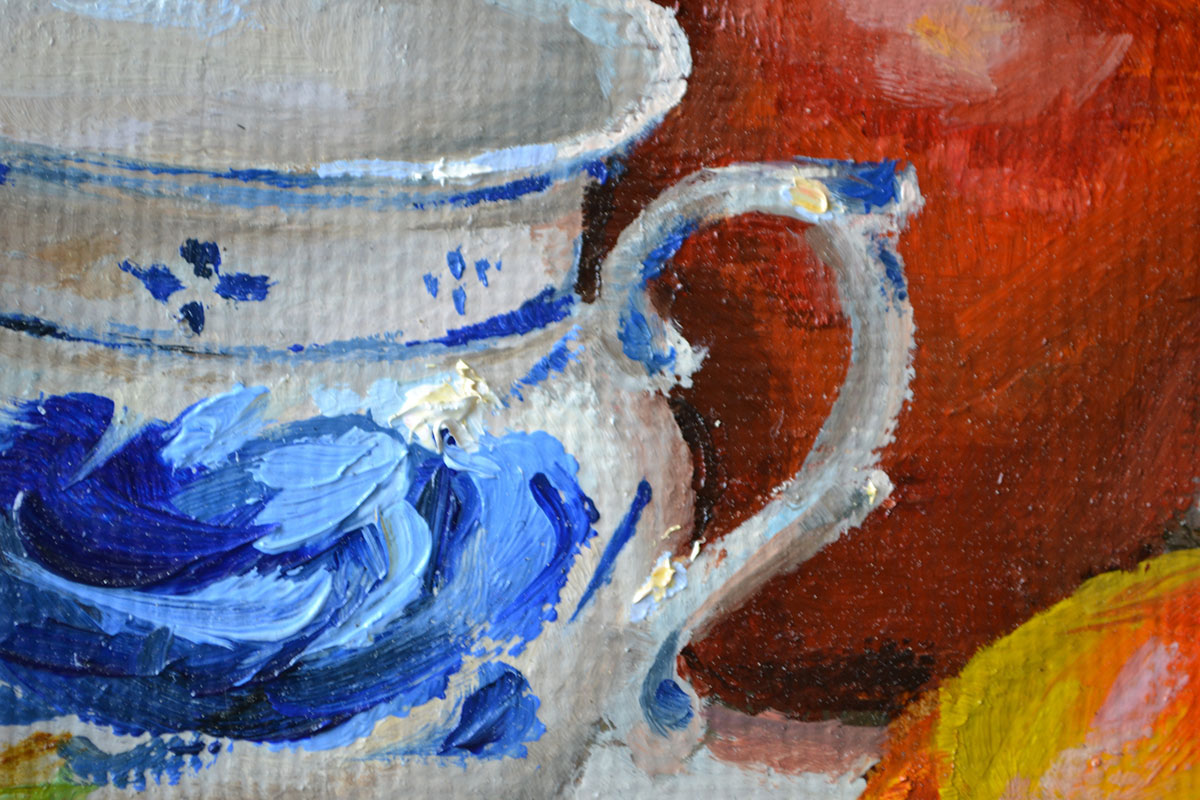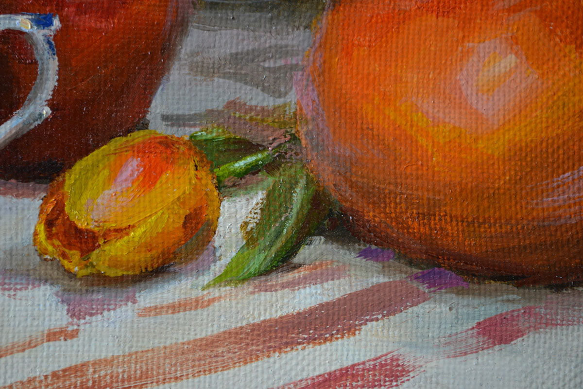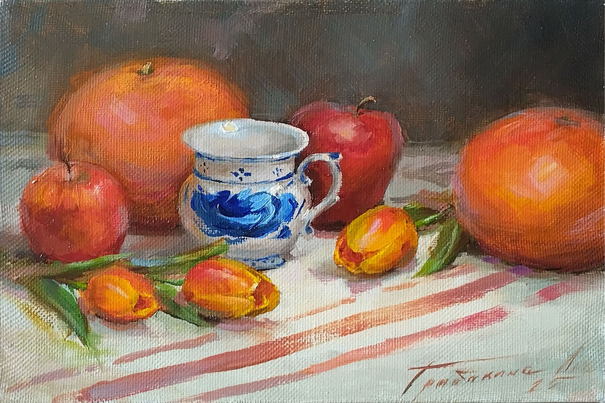 На картине изображен натюрморт, в центре которого находится изящная фарфоровая чашка с цветочным узором, окруженная яркими грейпфрутами, яблоками и тюльпанами. Композиция сбалансирована, благодаря чему глаз зрителя плавно перемещается от одного элемента к другому. Теплые оттенки оранжевого и красного создают атмосферу уюта и радости, в то время как холодные тона чашки добавляют контраста.