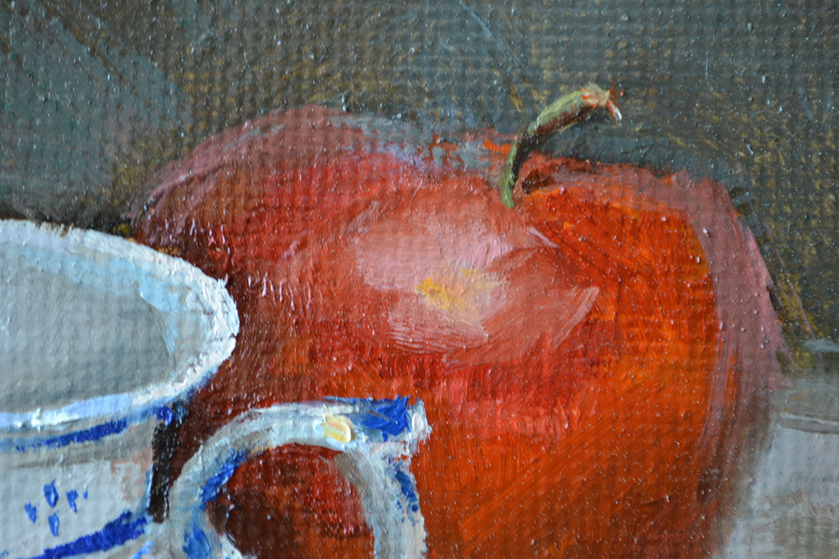 Свет подчеркивает текстуру фруктов и фарфора. Тени, отбрасываемые предметами, придают глубину и объем, создавая ощущение реальности. Игра света и тени делает картину особенно выразительной. Фрукты и цветы в натюрморте символизируют изобилие и красоту природы. Тюльпаны, как символ весны, добавляют нотку свежести и надежды. Чашка олицетворяет домашний уют и традиции, создавая связь между прошлым и настоящим.