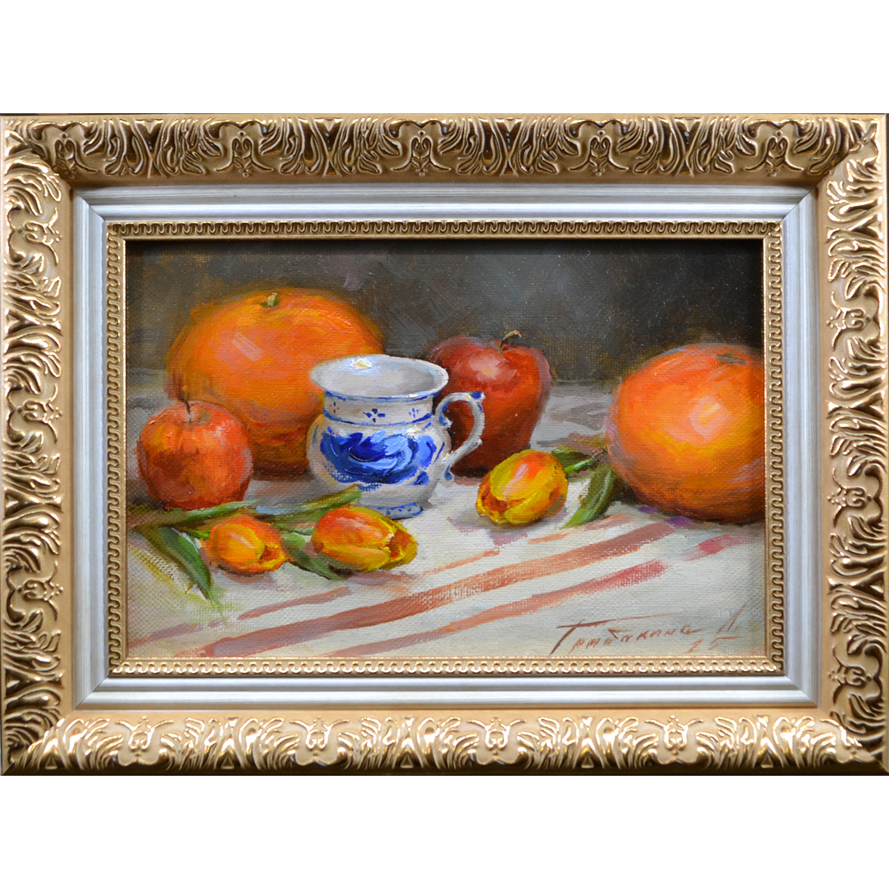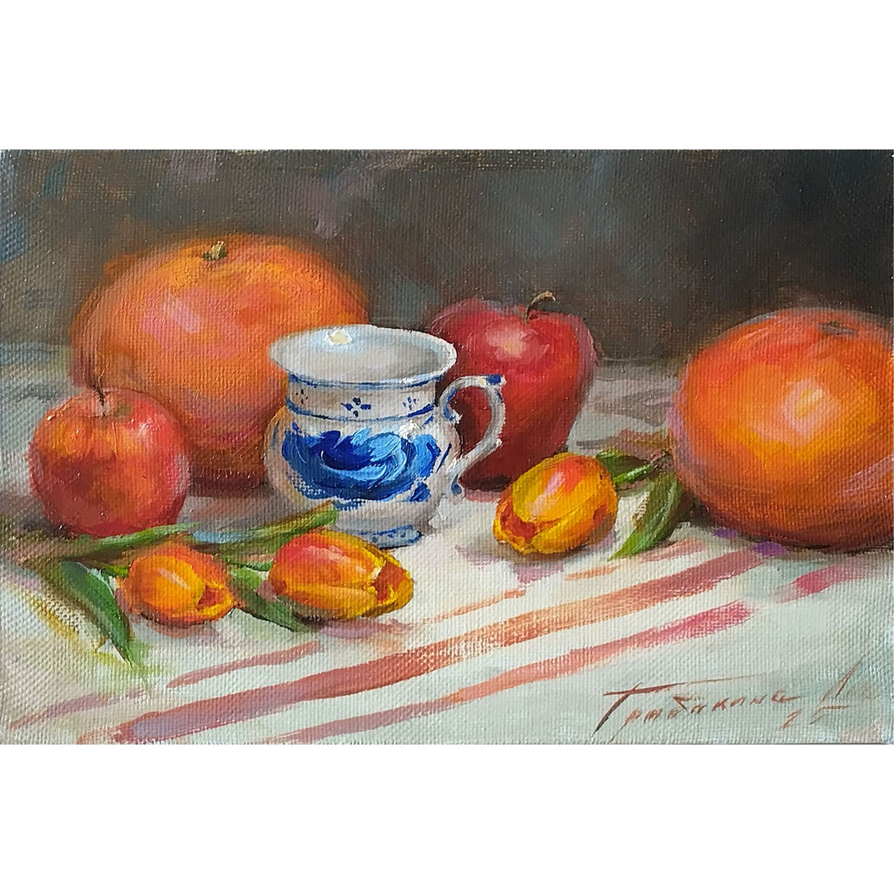Перед вами — изысканный натюрморт с грейпфрутами, который становится не просто украшением интерьера, а настоящим философским высказыванием о красоте повседневности. Вглядитесь: на холсте — сочные грейпфруты, яблоки, фарфоровая чашка с синим узором и яркие фрукты на скатерти с алыми полосами. Но разве не в этом проявляется истинная поэзия жизни?